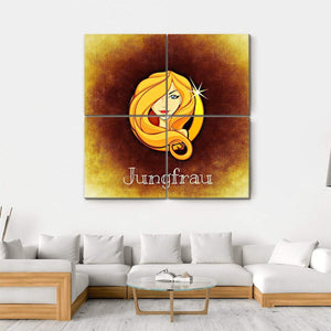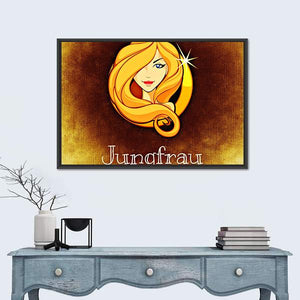Celebrate the Virgo zodiac with this mystical canvas art featuring a woman's face adorned with a stylized gold ring. The elegant palette of gold, brown, yellow, blue, and red creates an alluring atmosphere, making it a captivating addition to your wall decor.