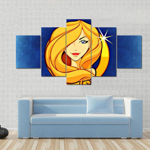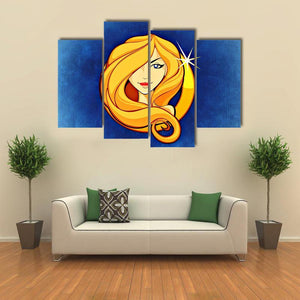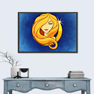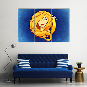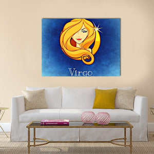 This Virgo Zodiac Sign canvas centers the Virgo symbol and name alongside a stylized golden-haired woman on a blue textured background. The graphic, modern composition uses blue, gold, tan, and red to create a decorative, astrological mood. It works well in modern or astrology-themed room decor.