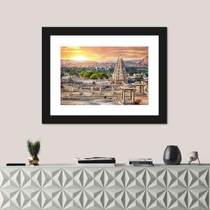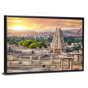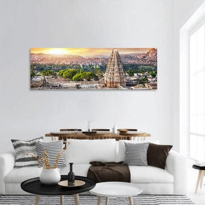 This panoramic canvas depicts the Virupaksha Temple in India at sunset, with mountains and trees framing the scene. Rendered in a realistic, scenic style with warm orange, yellow, green and brown tones, it brings a serene, majestic mood and works well in modern or traditional rooms.