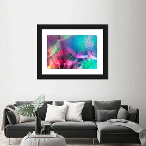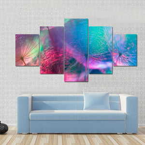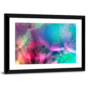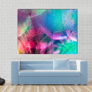 This vibrant abstract artwork features delicate dandelion seeds captured in a dreamy, macro style. The lively palette of pink, blue, green, and purple adds an ethereal touch to any space.