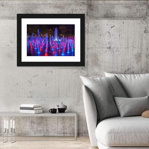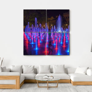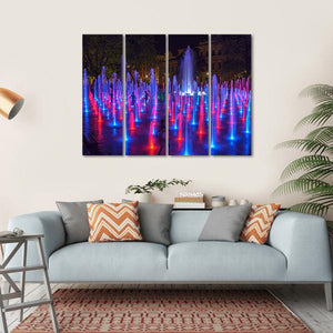 This vibrant canvas wall art captures dancing fountains illuminated by glowing jets of water, set against a backdrop of silhouetted figures and enchanting buildings. Its energetic palette of blue, red, and purple brings a lively atmosphere to any space.