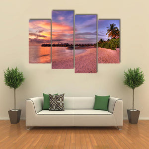 A photographic landscape of a beach with overwater bungalows, palm trees and soft clouds beneath a vivid pink, purple and orange sunset over the sea. The composition follows the rule of thirds and carries a vibrant yet serene, romantic mood that suits modern room decor like living rooms or bedrooms.