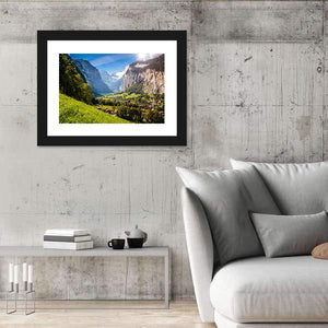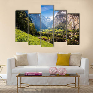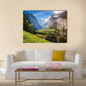 Vivid View Of Alpine Village Canvas Wall Art captures a panoramic mountain valley with a cascading waterfall and traditional alpine houses. The green and blue palette, punctuated by snow-capped peaks and lush hillsides, gives the scene a serene, majestic mood that suits modern living rooms and contemporary spaces.