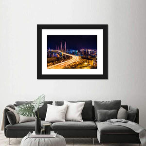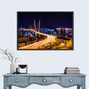 This canvas art captures the vibrant scene of the Hali Bridge in Vladivostok, illuminated by city lights against a deep night sky. Featuring an aerial view with streaks of light from vehicles, it brings an energetic urban vibe to your space.