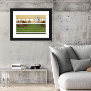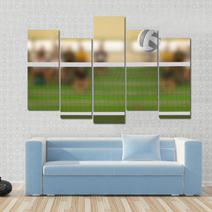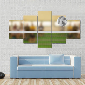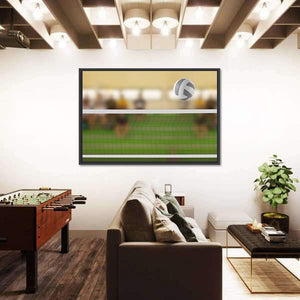 This canvas wall art captures a volleyball mid-air against a dynamic court scene. The modern design, featuring a vibrant palette of green, white, gray, and yellow, brings an active, sporty vibe to any space.