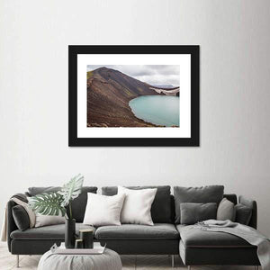 A panoramic canvas of a volcanic crater lake in Iceland, showing light blue water, dark brown and reddish volcanic rock, patches of snow, and green slopes. The scene reads serene and remote, with a natural palette of blue, brown, grey, and green. It suits modern or nature-inspired rooms that favor quiet, contemplative landscapes.