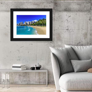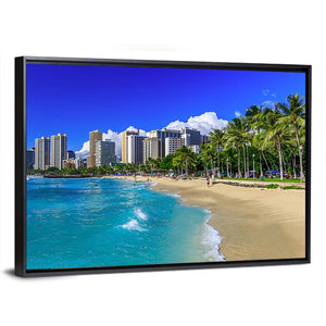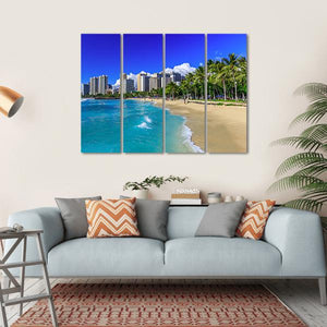 Bring home the sunny vibrance of Waikiki Beach with this striking canvas art. Featuring gentle ocean waves and the city's skyline against a backdrop of blue and tan, it captures a tropical atmosphere perfect for brightening any space.