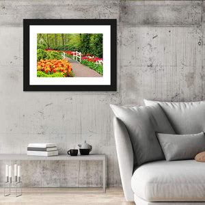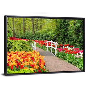 Experience the beauty of a vibrant tulip field at Keukenhof Gardens. This canvas art features a serene garden path, framed by colorful flowers and a charming brick walkway. Ideal for brightening up any space with a touch of nature's cheerfulness.