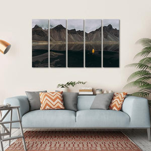 This canvas artwork beautifully captures the vast and awe-inspiring landscape of Iceland, featuring majestic mountains and a person in a vibrant yellow jacket against dark sand. Its minimalist yet dramatic style evokes feelings of solitude and exploration, adding a striking touch to any space.