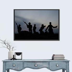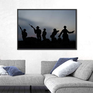 Soldiers Fighting Silhouettes captures soldiers in helmets and rifles as dark silhouettes against a dusky sky, setting a dramatic, somber, historical mood. The black, gray and purple palette with a rule-of-thirds composition creates strong contrast and quiet tension. It suits modern or military-themed room decor that favors thoughtful, atmospheric art.