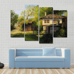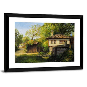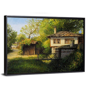 This canvas wall art features a rustic mountain village bathed in warm afternoon light. With its idyllic scene of traditional houses, lush greenery, and a charming wooden bridge, it evokes a peaceful, natural atmosphere perfect for any home.
