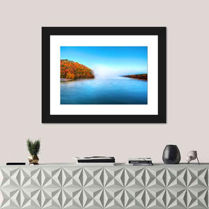 This calming canvas features a tranquil river scene with autumn trees and gentle mist hovering over the water. Its modern style and serene palette of blue, orange, green, and white make it a versatile addition to your home decor.