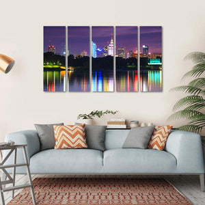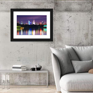 This vibrant canvas art captures the stunning skyline of Warsaw at night, with colorful lights beautifully reflecting on the waterfront. It's a serene piece that brings a metropolitan feel to any room.