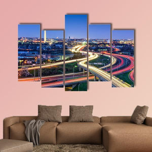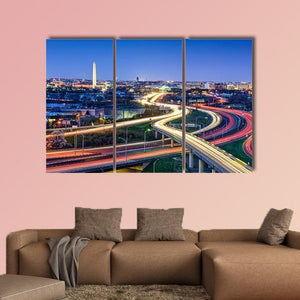 Washington D.C. skyline features the Washington Monument and a sweeping highway interchange, shown from an aerial perspective at dusk. Cool blues and greys with touches of yellow and red trace car light trails across a dynamic, modern cityscape, a good fit for modern living rooms or office walls.