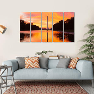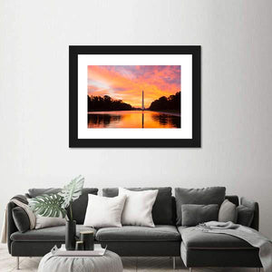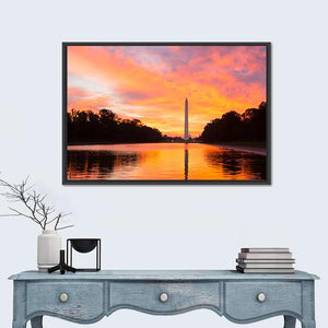 This canvas art beautifully captures the Washington Monument reflecting in the serene waters of the reflection pool during sunrise. The calm and vibrant palette of orange, pink, purple, brown, and blue imbues any space with a majestic atmosphere.
