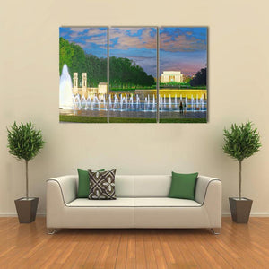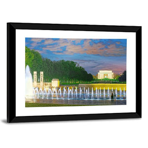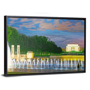 A photorealistic, wide-angle view of the Washington Monument with dancing fountains, the Lincoln Memorial and trees reflected on the water. Dusk clouds and an illuminated building create a peaceful, serene and grand atmosphere. Suits modern homes and room decor.