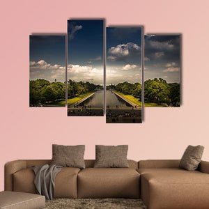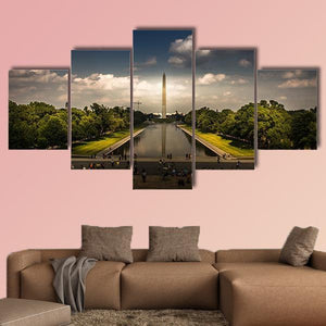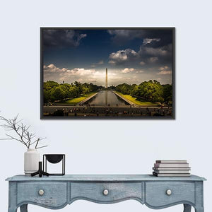 A realistic landscape of the Washington Monument reflected across Mirror Lake, with trees along the water and small figures visible in the distance. The symmetrical composition and a blue‑green‑gray palette create a grand, reflective mood that works well in modern or nature‑inspired rooms.