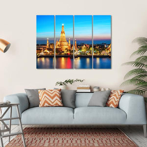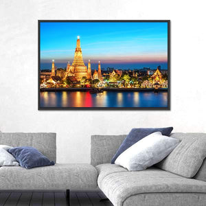 This canvas wall art beautifully captures the serene glow of Wat Arun, a stunning temple in Thailand. The vibrant palette of blues, yellows, and oranges reflects the illuminated city skyline and serene river, creating a captivating scene.
