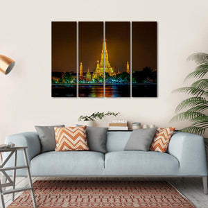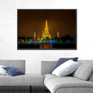 This canvas art captures the serene beauty of Wat Arun Ratchawararam Temple in Bangkok, illuminated against a night sky. The vibrant hues of yellow, orange, and blue reflect off the river, creating a majestic scene that adds a touch of calm to any space.