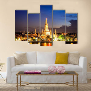Photorealistic canvas print of Wat Arun temple in Bangkok at night, showing the temple complex and river with the central spire lit and reflections on the water. The blue, gold and white palette creates a serene, majestic atmosphere that works well in modern living rooms or a quiet meditation corner.
