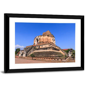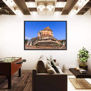 A low-angle view of Wat Chedi Luang in Chiang Mai highlights the temple’s tiered pagoda, stone steps and arched entrances. Calm blues, tans and browns give the image a serene, architectural presence that suits modern homes and quiet spaces.