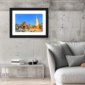 This serene artwork features the stunning temple of Wat Phra Singh in Chiang Mai, capturing its ornate roof and golden spire against a clear blue sky. The vibrant palette of gold, blue, and green brings the tranquil nature of the scene to life, making it a beautiful addition to any space.