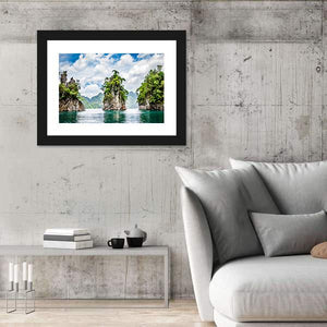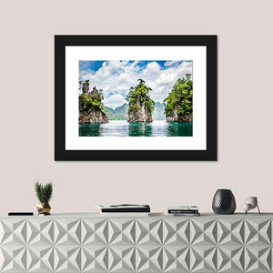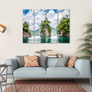 Capture the serene beauty of Thailand with this photorealistic canvas art. It depicts limestone karsts rising dramatically above calm waters, framed by lush tropical foliage and a vibrant sky. This landscape creates a natural vibe that complements various decor styles.