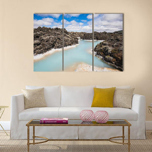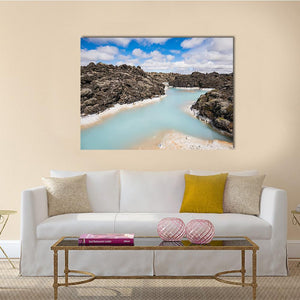 Blue Lagoon Iceland Canvas Wall Art shows a geothermal pool framed by dark, rough lava formations and fluffy white clouds, with milky blue water set against a cool blue‑grey and brown palette. Composed with depth and rule-of-thirds framing in a nature photography style, it has a serene, natural sense of vastness that fits living rooms and nature-themed rooms.