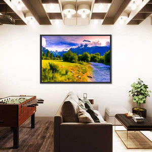Blue River Watercolor Panoramic Canvas captures a river winding through a mountain meadow beneath soft clouds, painted with impressionistic brushstrokes for a peaceful, natural feel. The panoramic, rule-of-thirds composition uses greens, blues, yellows, purples, and white to create a calm, serene atmosphere. Suits modern or nature-inspired rooms that need a restful focal point.
