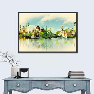 This panoramic watercolor illustration beautifully captures the vibrant skyline of Budapest, featuring the Danube River, the iconic Parliament Building, and bridges. The artistic use of blue, green, yellow, and brown creates a lively, scenic atmosphere perfect for any wall.