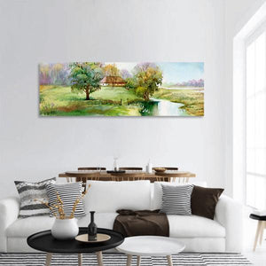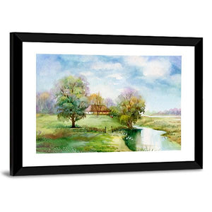 A peaceful watercolor painting of a village with a thatched house, winding river, tall trees and lush green fields. Soft greens, blues and warm browns create an idyllic, serene mood that suits living rooms, hallways, or country-inspired and modern spaces.