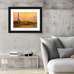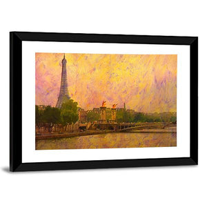 This captivating watercolor painting features the iconic Eiffel Tower set against a vibrant Parisian backdrop. The impressionistic style, with warm hues of yellow, orange, and pink, evokes a lively cityscape, perfect for bringing warmth and charm to your wall decor.