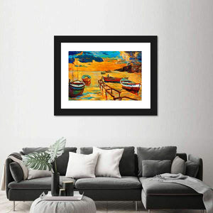 This canvas art beautifully captures a serene boat and jetty scene, accentuated by vibrant colors of orange, blue, and yellow. Its abstract style and thick brushstrokes bring energy to any space, making it perfect for lovers of modern decor.