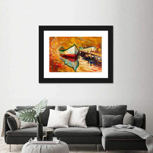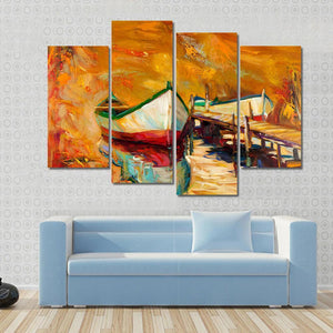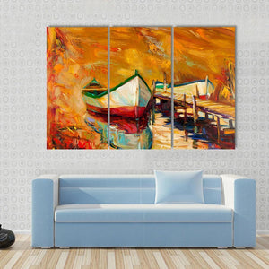 This vibrant canvas art features an abstract depiction of boats and a dock, capturing a serene moment on the water. The warm palette of oranges, reds, and blues creates a lively atmosphere, perfect for brightening up any space.
