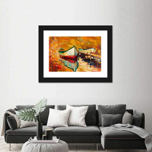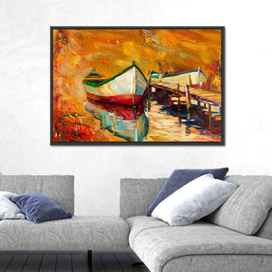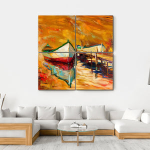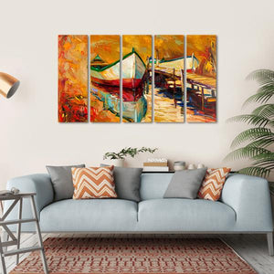 This vibrant canvas art features boats against a scenic dock, reflecting calm waters and a painted sky in warm hues of orange, red, and blue. Its abstract style adds a tranquil touch to any space.