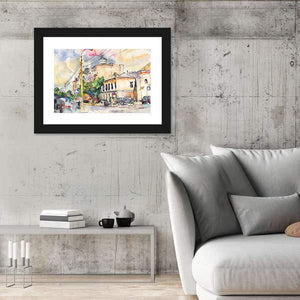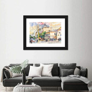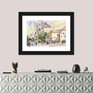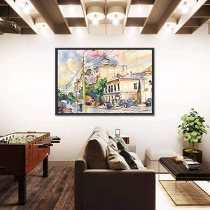 This canvas art captures a lively cityscape with buildings, trees, and cars, portrayed in a warm watercolor style. Its nostalgic and bright vibe makes it a wonderful addition to any urban-themed decor.