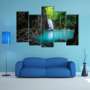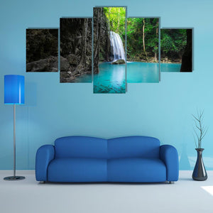 Erawan Cascade Waterfall Canvas shows a cascading waterfall flowing into a turquoise tropical pool, surrounded by lush green forest and schools of small fish, creating a serene, tranquil, and vibrant scene. Rendered in a nature-photography style that emphasizes depth and framing, it suits modern or tropical-inspired rooms looking for calm, natural wall art.