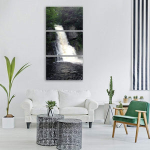 A centered waterfall cascades over rocks, surrounded by green trees and white, foamy water. The realistic landscape feels powerful and serene, making it well suited for modern or nature-inspired wall decor.