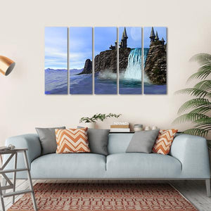 This captivating artwork features a serene waterfall cascading in front of a majestic castle, creating a tranquil atmosphere. With its dreamy blue and white palette, it invites a sense of fantasy and wonder to your space.