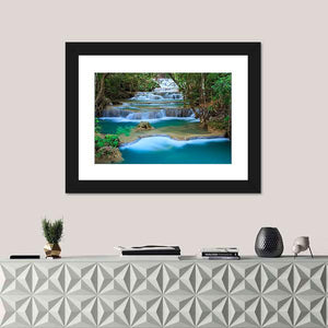 This canvas artwork captures the serene beauty of a waterfall nestled within the lush forests of Kanchanaburi, Thailand. The refreshing scene, enhanced by a tranquil palette of blues, greens, and browns, brings a sense of calm to any space.