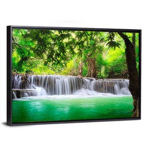 This canvas art captures a vibrant waterfall surrounded by lush foliage in Kanjanaburi, Thailand. The serene scene showcases the refreshing movement of water against a backdrop of green and brown tones, adding a touch of nature's beauty to your space.