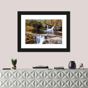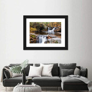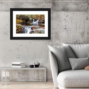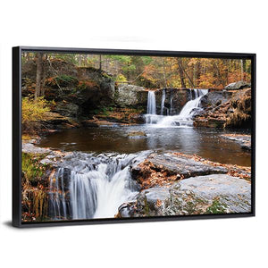 This beautiful canvas features a serene waterfall cascading over rocks, surrounded by trees adorned with fall foliage. The tranquil palette of browns, greens, and whites captures the essence of nature, making it a perfect addition to rustic decor.