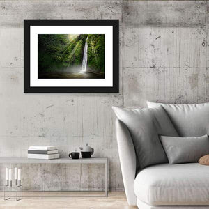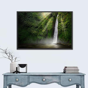 This breathtaking artwork captures a serene waterfall surrounded by lush green vegetation in Munduk, Bali. Sunbeams pierce through the foliage, creating a tranquil atmosphere perfect for nature lovers and a calming touch for your living space.