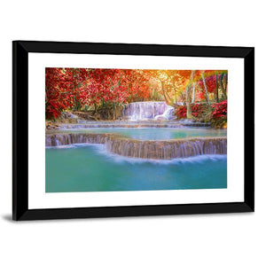 A photorealistic panoramic print of a multi-tiered waterfall flowing through a lush rain forest, with rocks, trees and a calm pool. Vibrant red foliage and a blue-green palette give the scene a serene, tranquil mood. Suited to modern or nature-themed rooms as a calming wall accent.