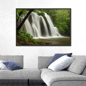 This canvas art captures the serene beauty of a waterfall surrounded by lush green foliage in the Jura Mountains. It evokes a tranquil, natural atmosphere that brings the essence of the outdoors into your home.