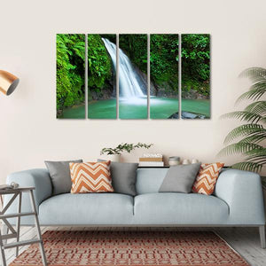 This canvas art features a serene waterfall surrounded by lush greenery, capturing the natural beauty of Guadeloupe’s national park. The tranquil palette of greens, blues, and whites evokes a peaceful atmosphere, making it a calming addition to your home decor.