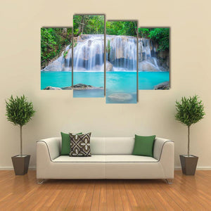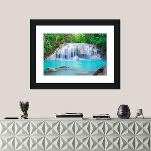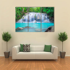 A realistic canvas of a cascading waterfall set in a lush tropical forest, with clear turquoise water, green foliage, and rocks in the pool. The scene feels serene, refreshing, and majestic, and suits modern or nature-themed room decor in the home.