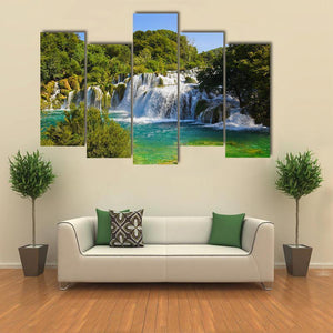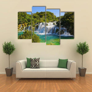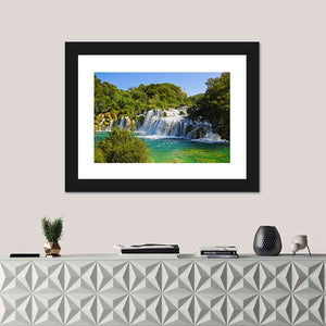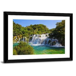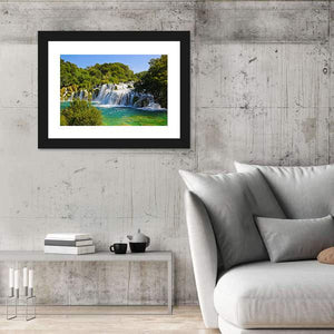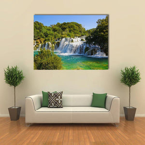 This canvas art captures the serene beauty of a cascading waterfall surrounded by lush, tropical foliage in Croatia. The vibrant blues and greens evoke a natural atmosphere, making it an ideal addition to any nature-inspired decor.