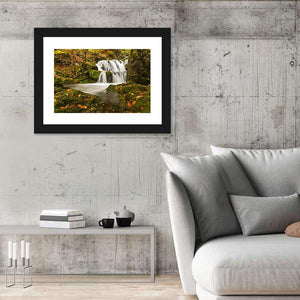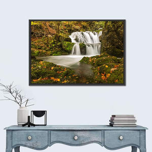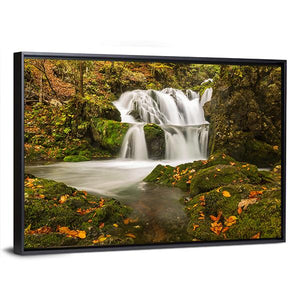Experience the tranquility of Waterfall Kropa nestled in the Voje Valley. This canvas captures the serene beauty of cascading water surrounded by vibrant autumn leaves and lush forest, creating a natural retreat for your walls.