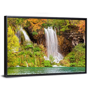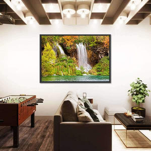 This canvas art captures the serene beauty of the Plitvice Lakes, featuring a cascading waterfall surrounded by vibrant autumn foliage. The rich greens, blues, and earthy tones create a natural and inviting atmosphere.